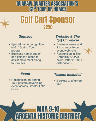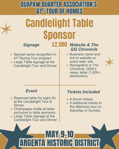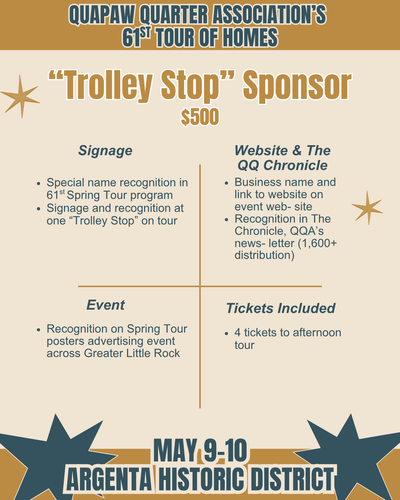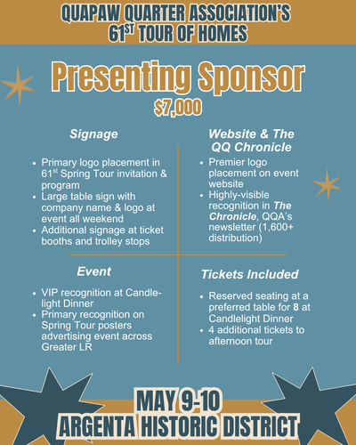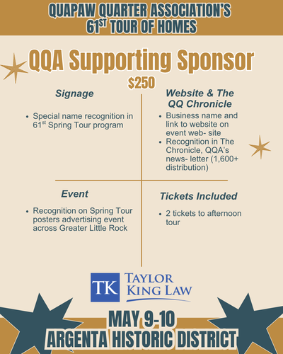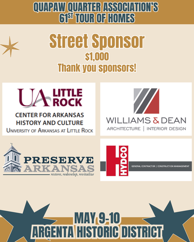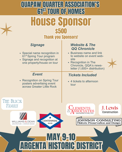For more than 60 years, the Quapaw Quarter Association (QQA) has worked to preserve and celebrate Greater Little Rock’s historic places. One of our most impactful outreach and education efforts is our annual Spring Tour of Homes, and we are thrilled to share that our 61st Tour of Homes will take place Mother’s Day weekend, May 9–10, 2026, in the beautiful Argenta Historic District. Contact our Executive Director, Morgan Weithman, at morgan.weithman@quapaw.com or 501.371.0075 ex. 2 for more information.
