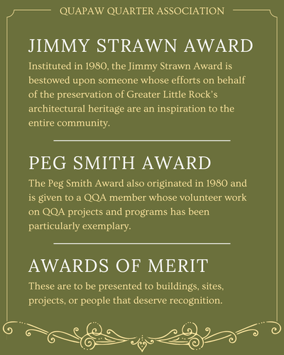 Instituted in 1980, the Jimmy Strawn Award is bestowed upon someone whose efforts on behalf of the preservation of Greater Little Rock’s architectural heritage are an inspiration to the entire community.